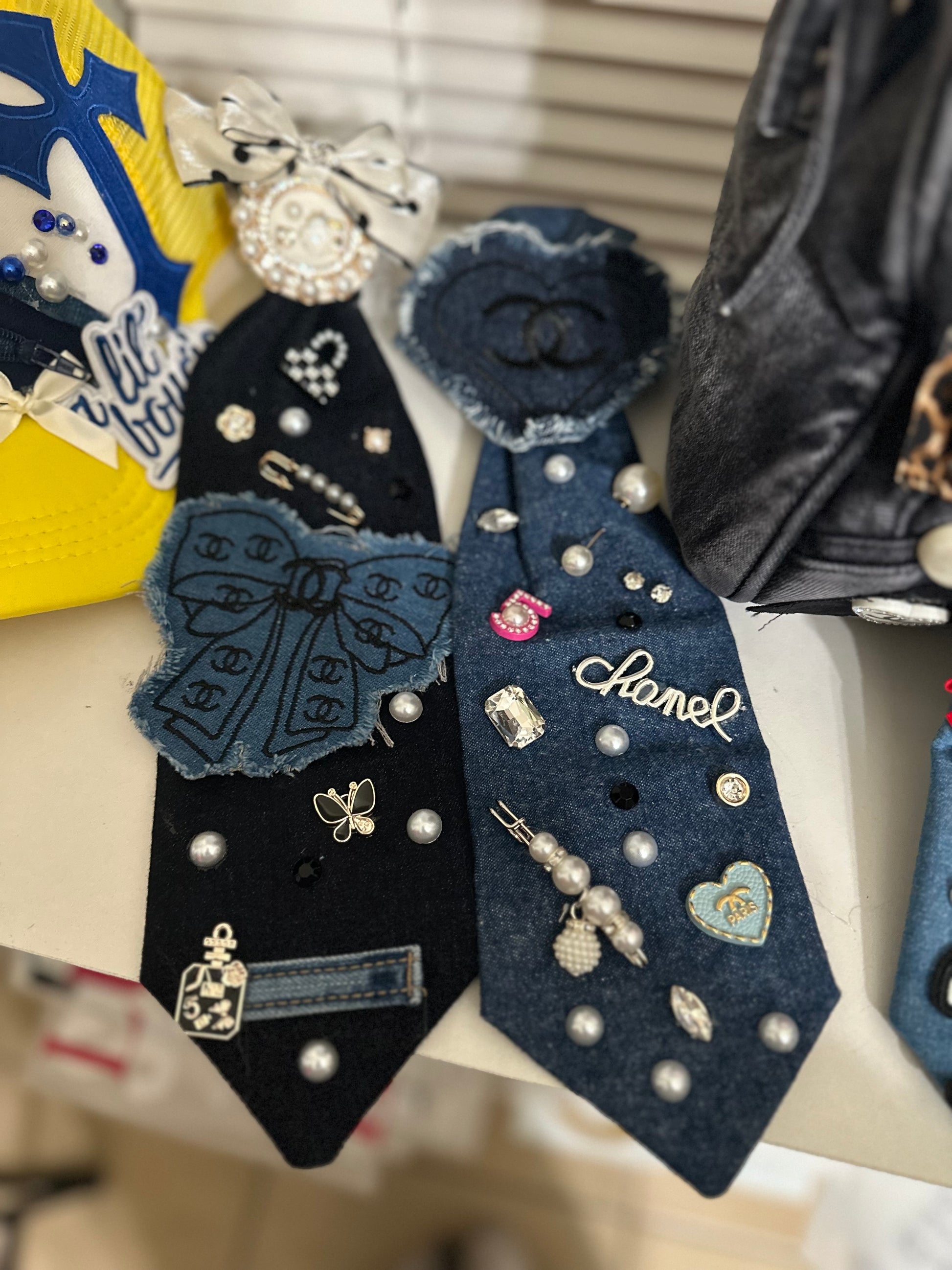 Channeling the timeless elegance of Chanel with a modern, street-lux twist. Each custom denim tie is handcrafted and designer-inspired, featuring signature embellishments such as pearls, tweed textures, appliqués, and statement pins — all personally curated by Dee Moore.