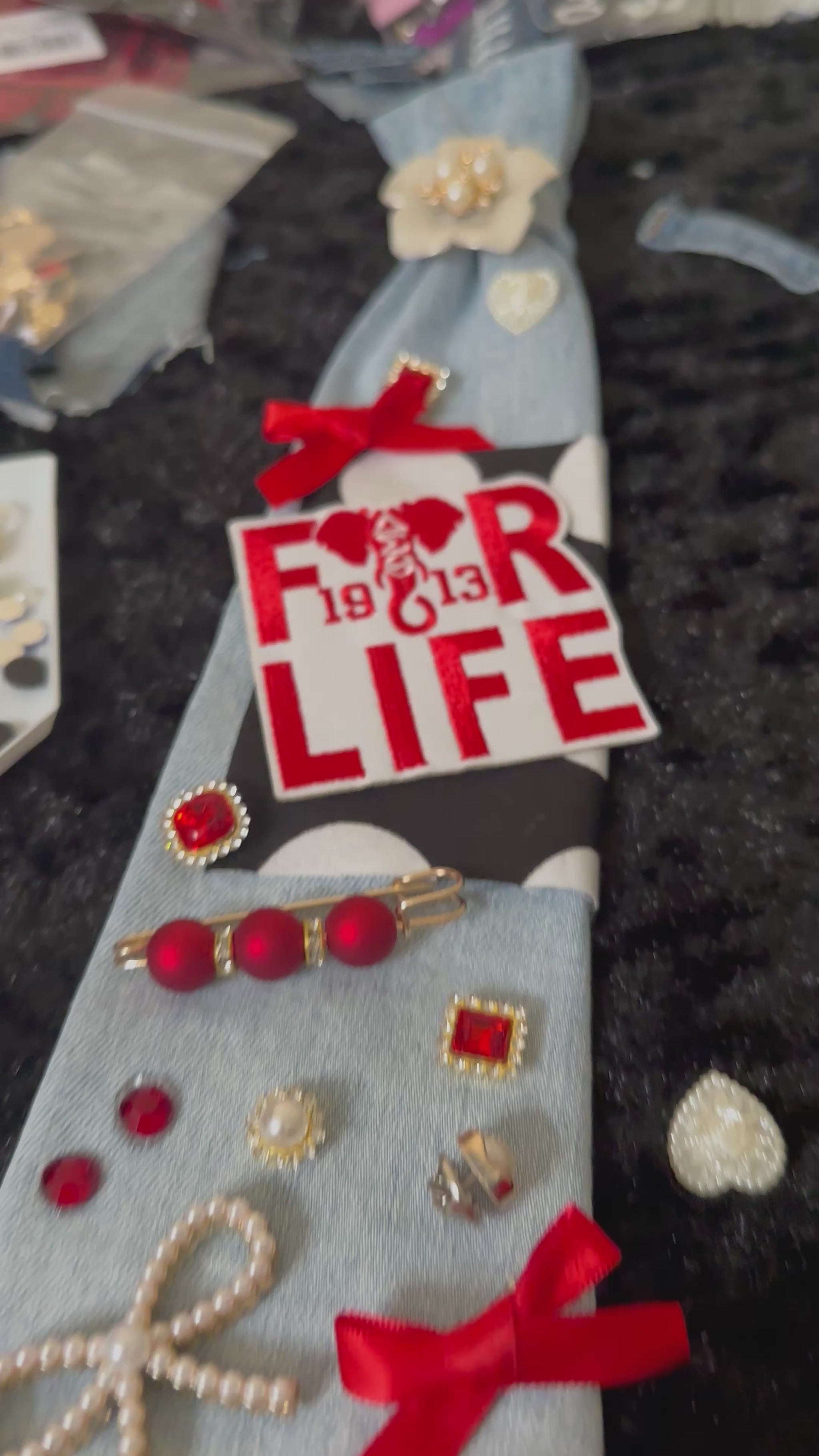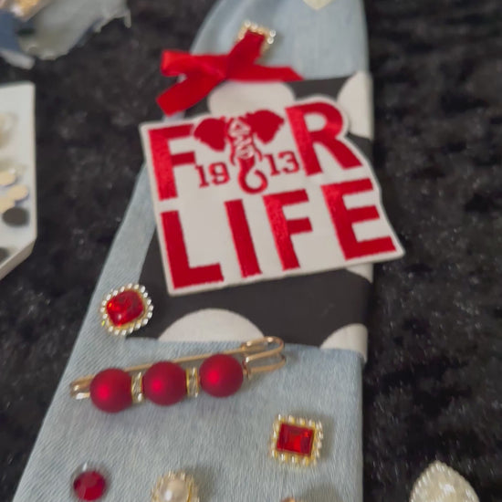 Each tie tells its own story — bold, brilliant, and unapologetically unique. Handcrafted with a mix of denim, pearls, safety pins, patches, and statement embellishments, this piece pays tribute to the power and sisterhood of Delta Sigma Theta. No two ties will ever look the same — each one is remixed and styled by hand, making it as distinctive as the woman who wears it