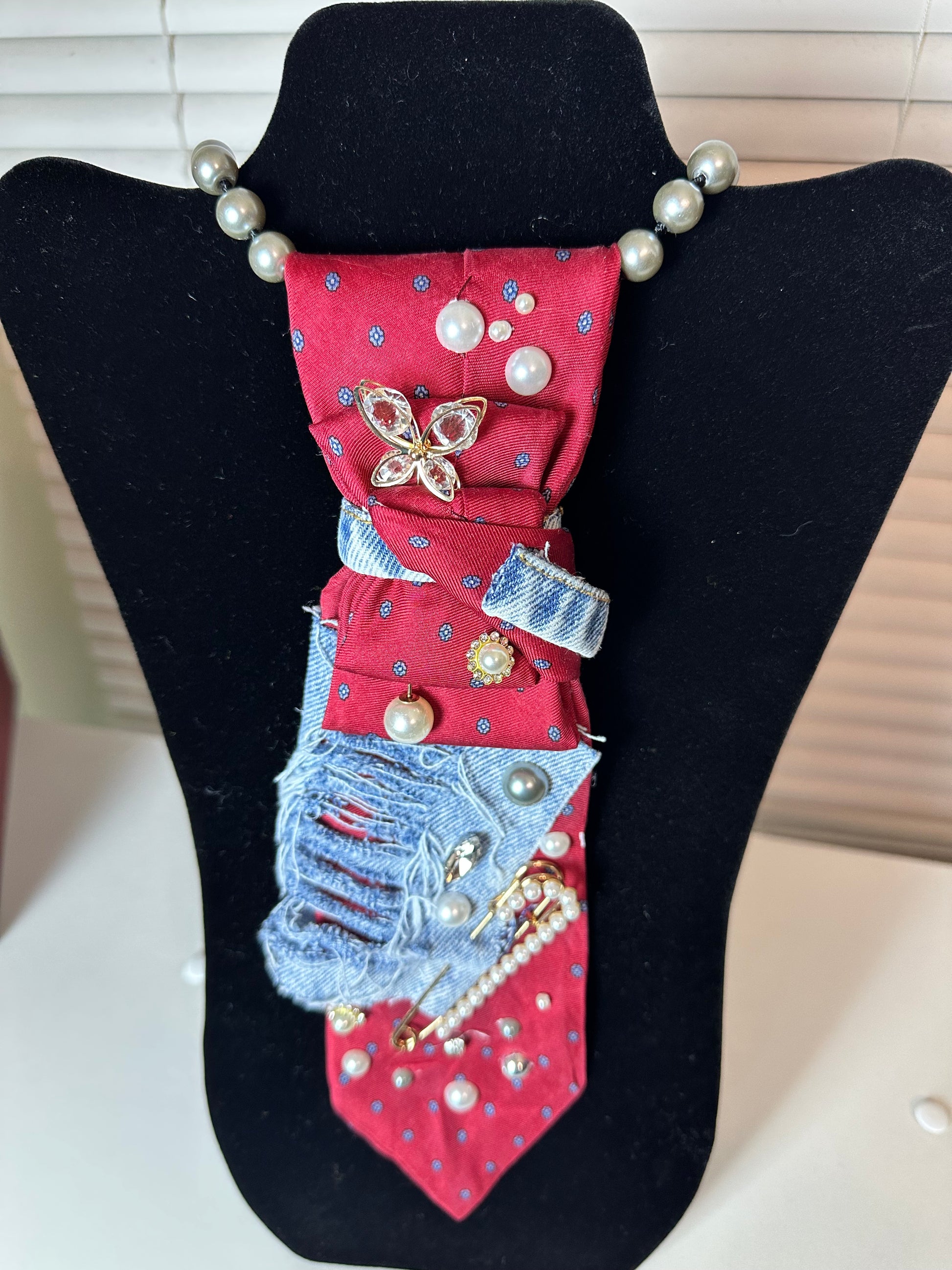 Reworked Royalty is a bold fusion of heritage and edge. Featuring a rich red base layered with distressed denim, pearls, and vintage-inspired accents, this piece honors tradition while rewriting the rules. Every detail is intentionally imperfect—celebrating resilience, reinvention, and elevated street elegance. This is not just fashion; it’s a crown for those who rose anyway.