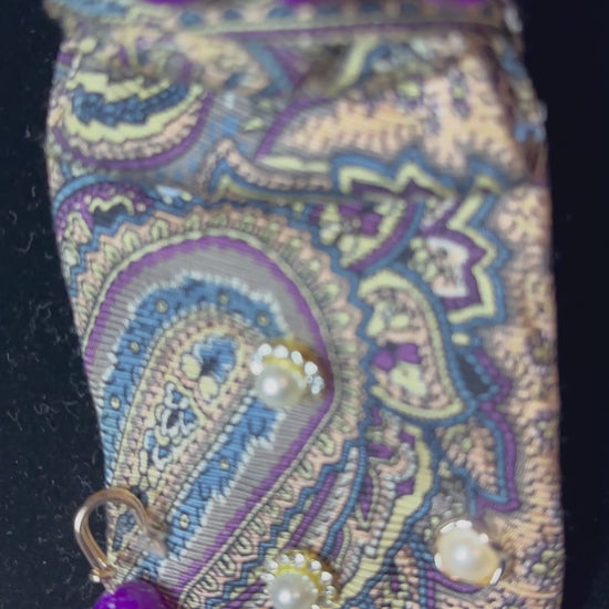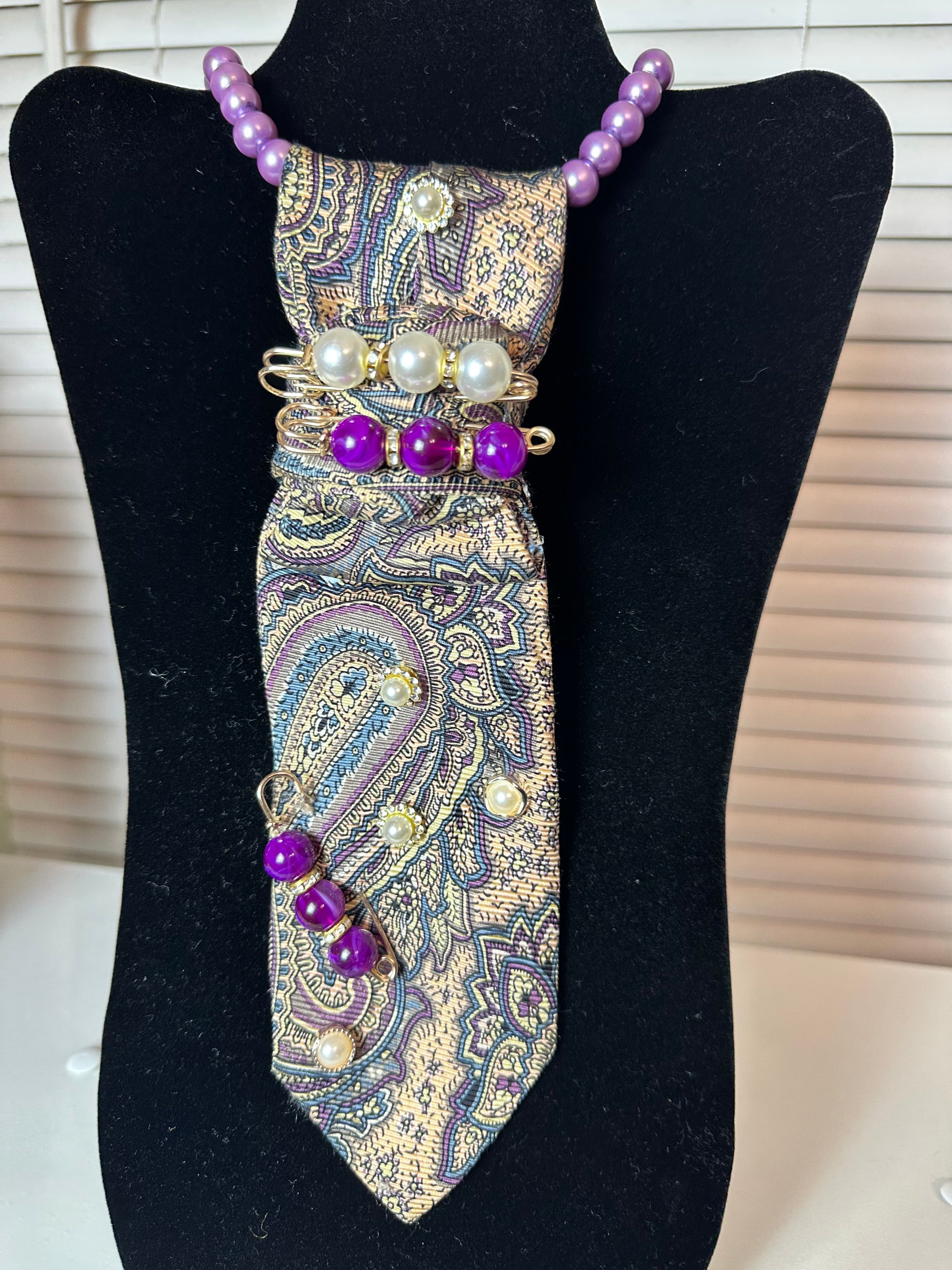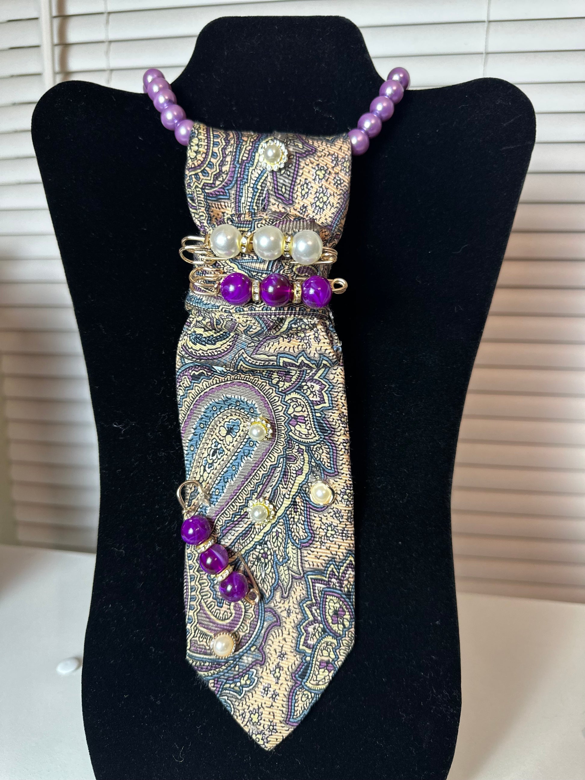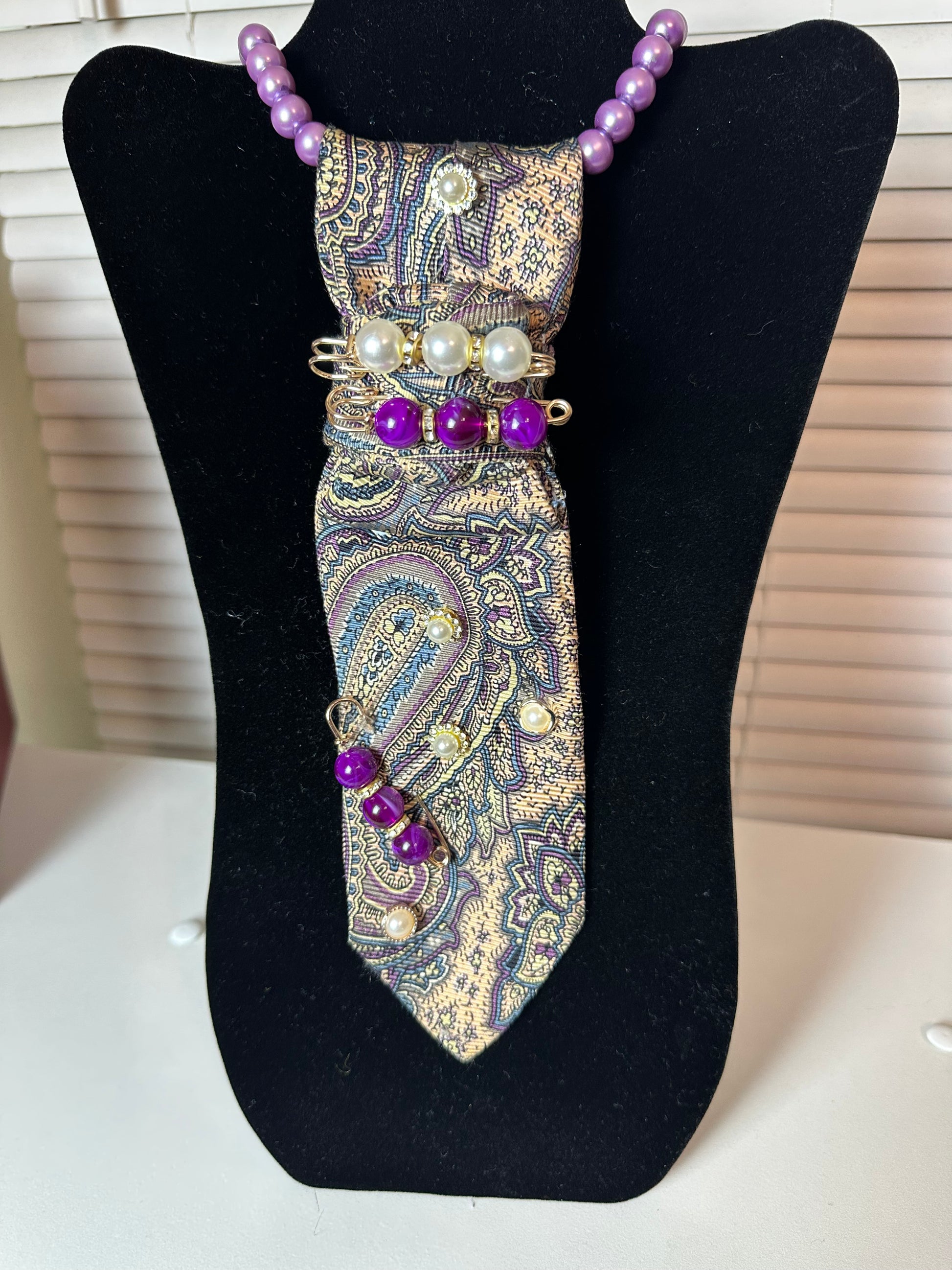 Royal Intent is where classic refinement meets bold self-expression. Crafted from a richly patterned paisley base, this piece is elevated with layered pearls, deep violet accents, and sculptural wire detailing that commands attention. The purple tones symbolize power, purpose, and confidence—making this tie a declaration, not an accessory. Designed for those who lead with intention and aren’t afraid to be seen.
